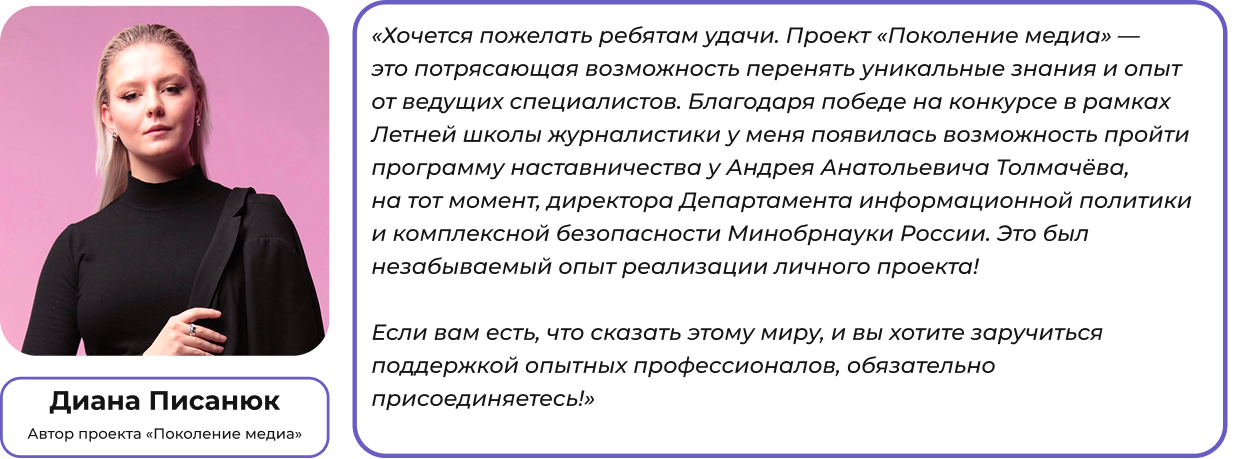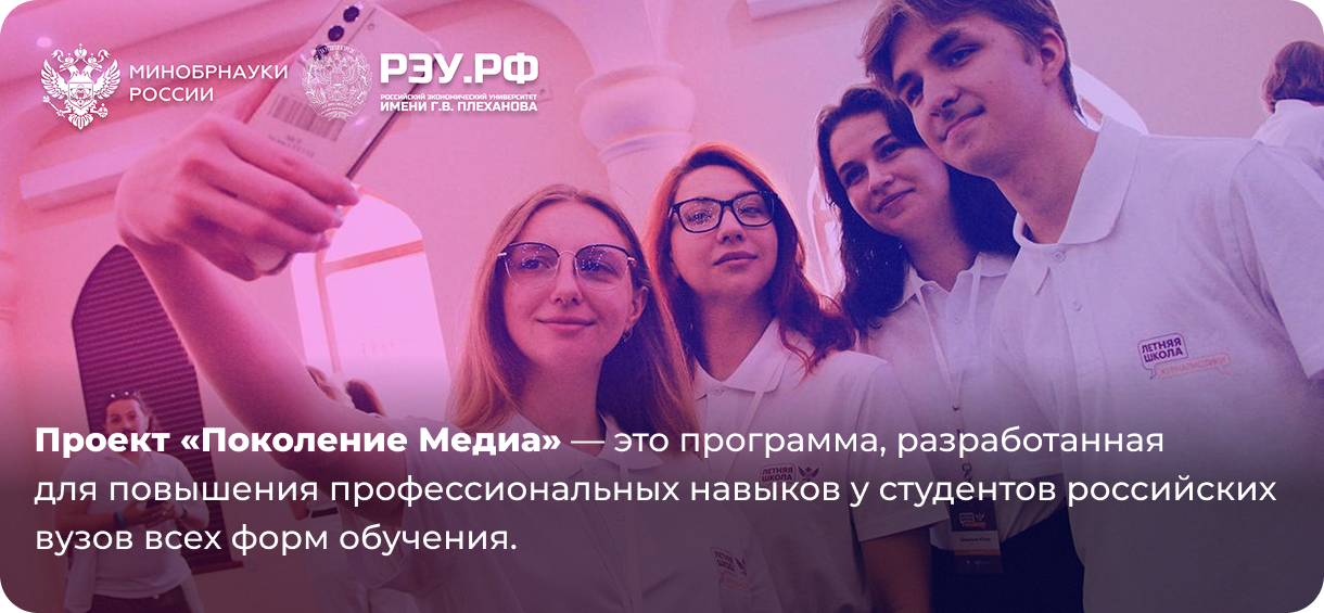 Проект «Поколение медиа» создаёт условия для профессионального роста и раскрытия потенциала студенческой молодёжи в интересах России и её регионов через вовлечение участников в проектную деятельность и работу с экспертами из разных сфер